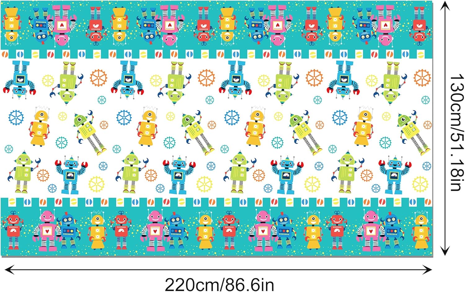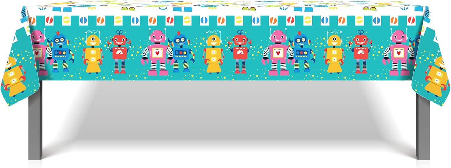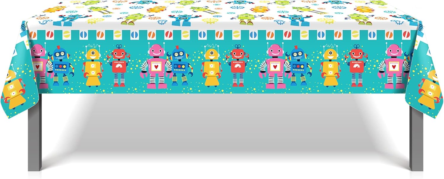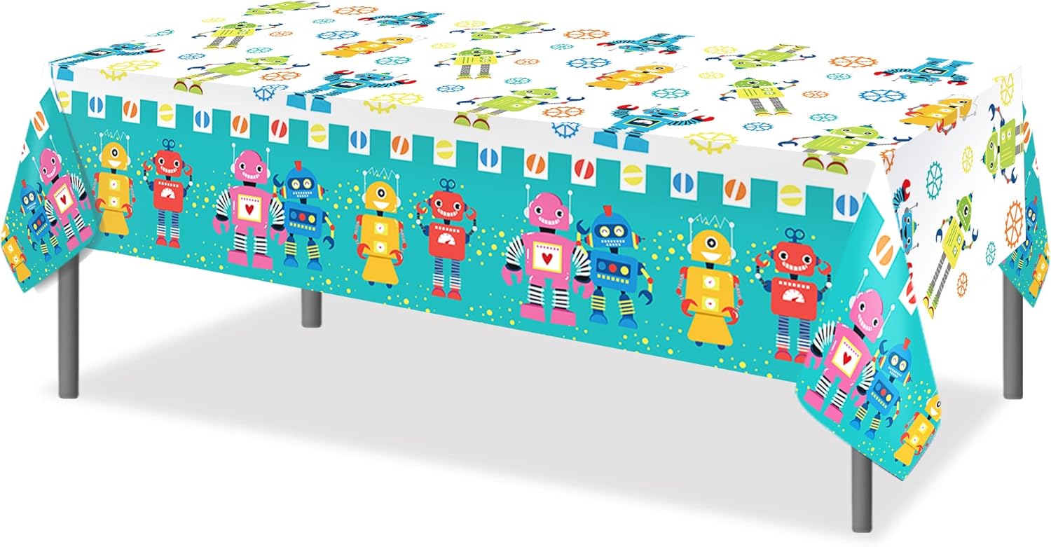 Package includes: This Cartoon Table Cover Decoration Supplies Pack includes 2 pcs measuring 54 x 87 inches fall tablecloths, fits most refreshment tables, gift tables. The quantity is sufficient for Robot Theme Party Decoration or daily replacement. (Note: Please read the product dimensions carefully when purchasing)