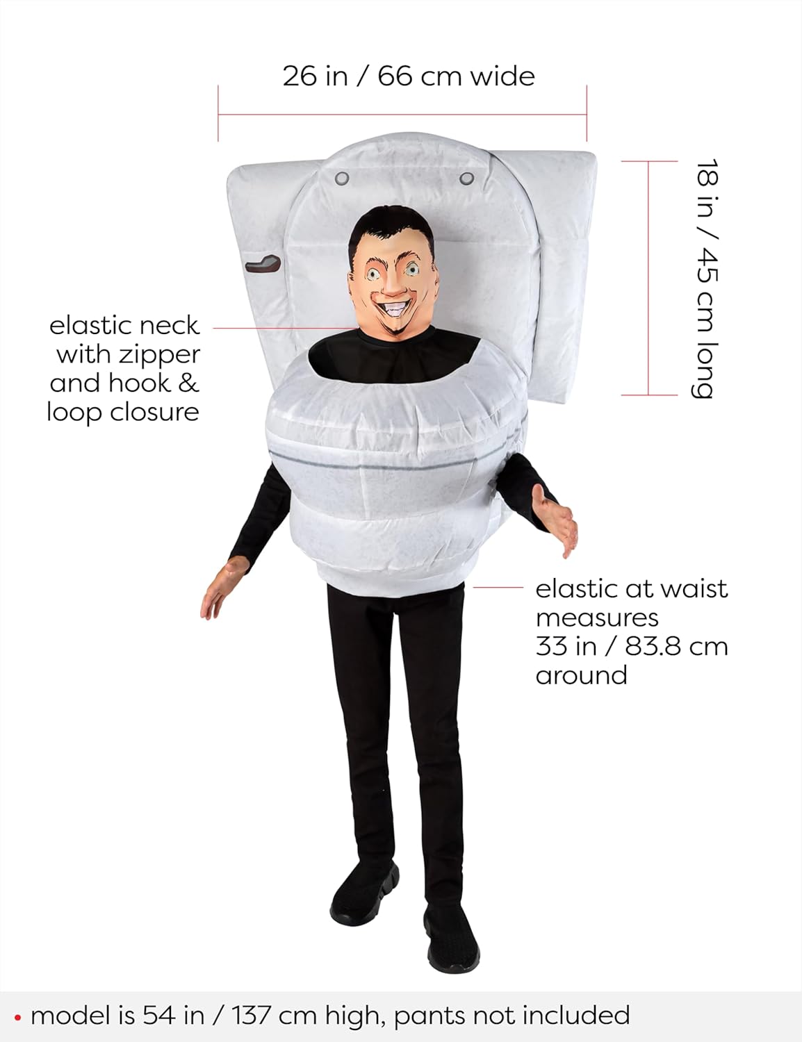Transform into a hilarious character this Halloween with the officially licensed Skibidi Toilet kid’s inflatable costume, ensuring you receive an authentic and safety-tested product as marked on the packaging. This unique costume features easy inflation thanks to a built-in fan, allowing for effortless setup at themed parties, cosplay events, or trick-or-treating. Designed to fit children in sizes Small-Medium, it comfortably accommodates torso sizes between 22″ and 28″, so your little one can enjoy a perfect look and feel. The costume includes flexible arm holes that measure 10″ around unstretched and 15″ when stretched, allowing for freedom of movement and comfort during wear. Since 1950, Rubies Costume Company has been dedicated to creating memorable costumes that bring joy to families everywhere. The fan operates on four AA batteries (not included), so be sure to avoid rechargeable or nickel-cadmium batteries for the best performance. Get ready to steal the show with this fun and whimsical inflatable costume!
