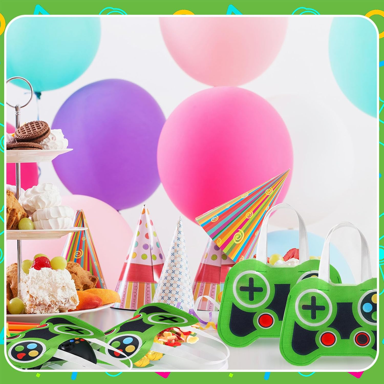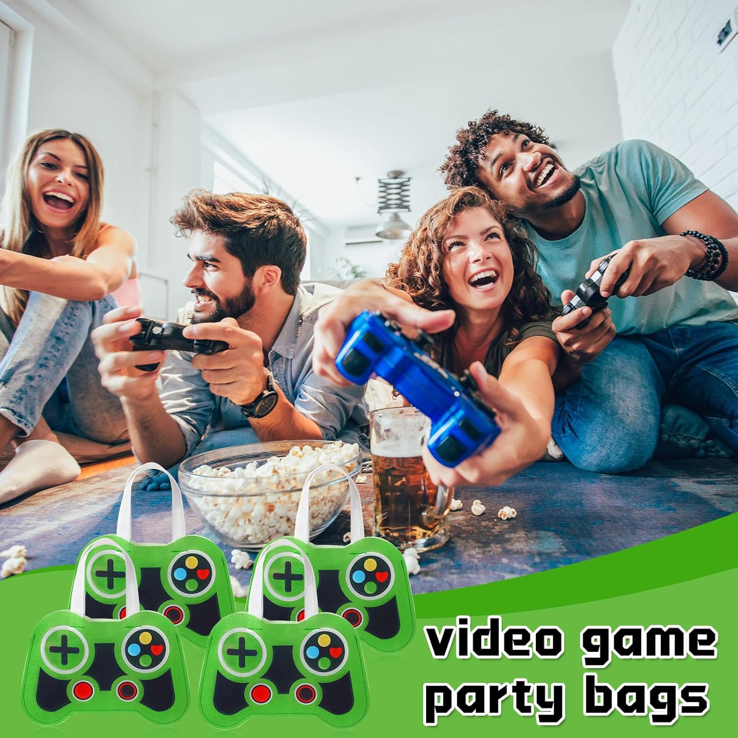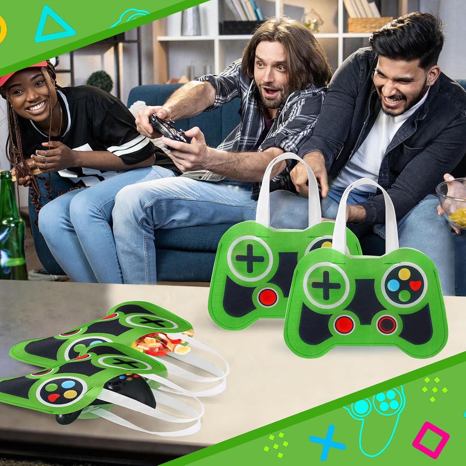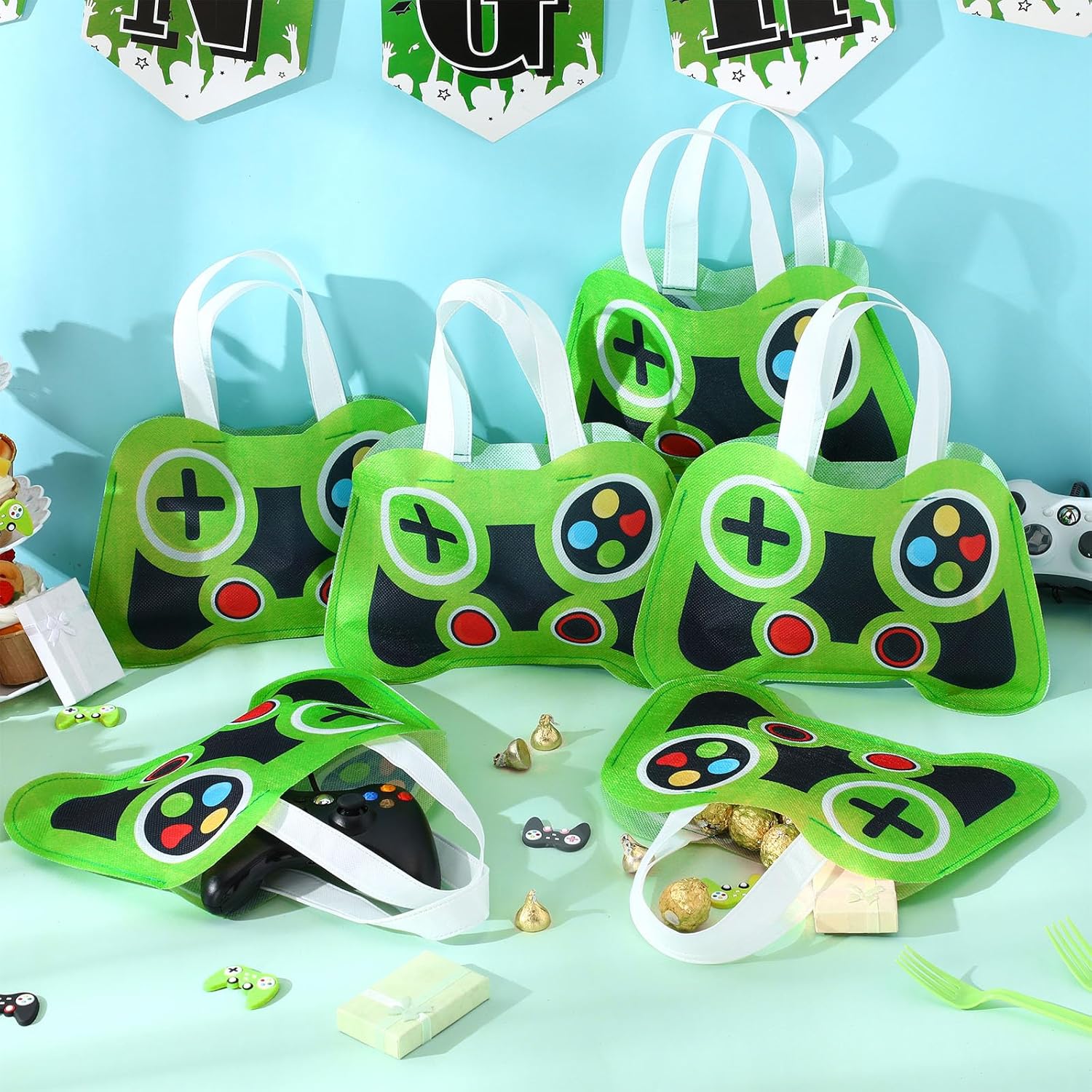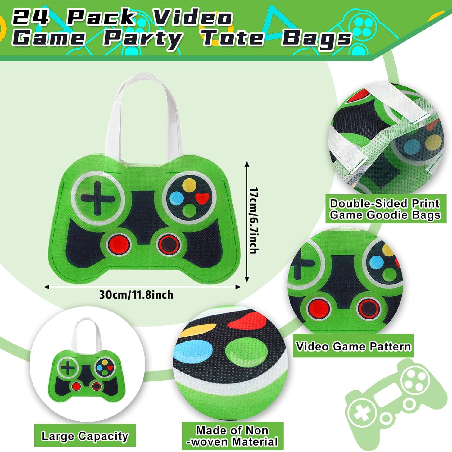 Bulk Availability: don’t worry about running out of party favors at your next gaming themed event; The package contains 24 generous video game party tote bags in green game controller color, the unique game handle pattern design is believed to be the ideal decoration for your party