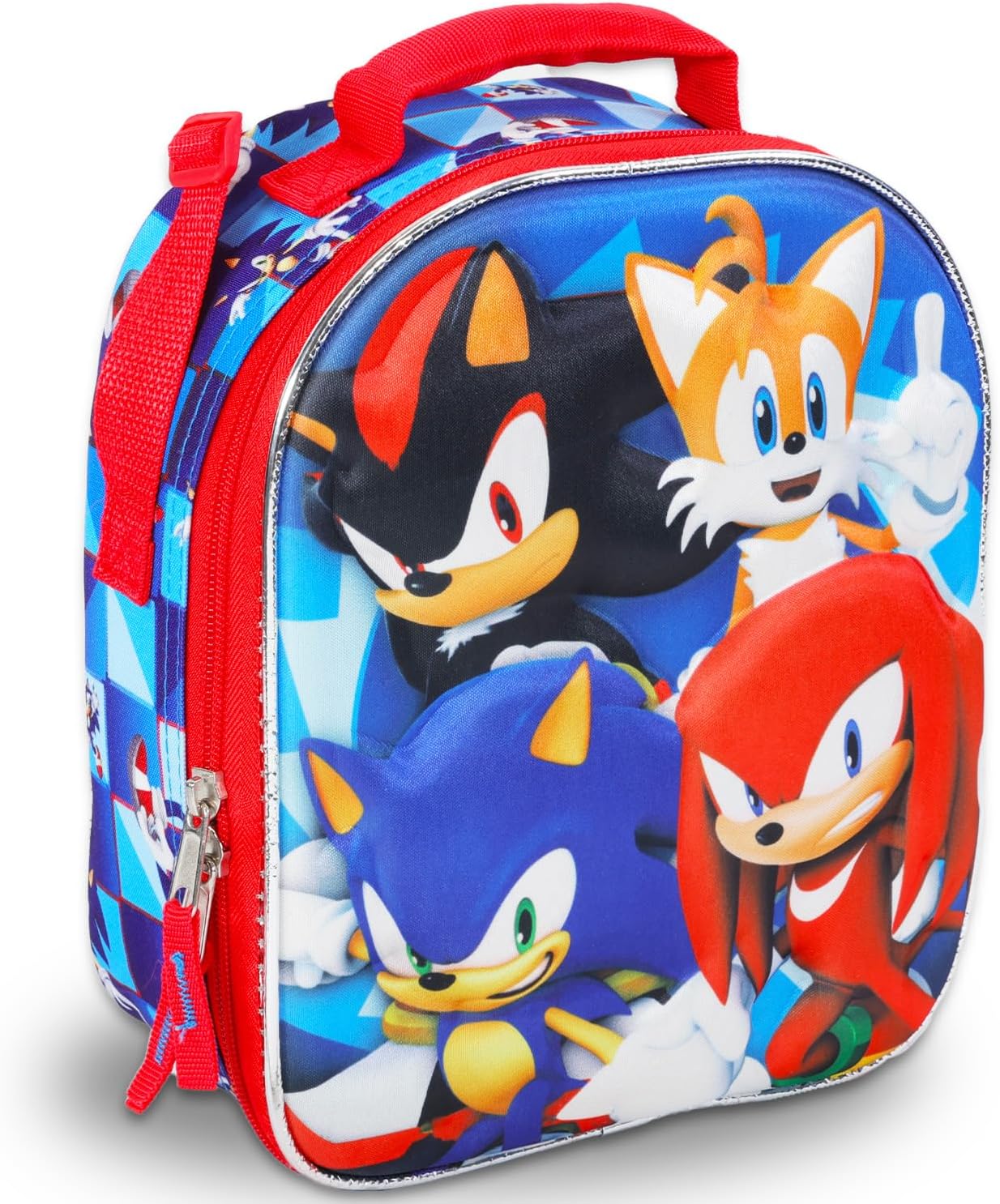 This Sonic the Hedgehog school supplies set includes one 9×8 inch insulated rectangle lunch bag with mesh side pockets, adjustable shoulder strap, and sparkling sequins. Lunch box features colorful artowrk of Sonic, Shadow, Tails, and Knuckles.