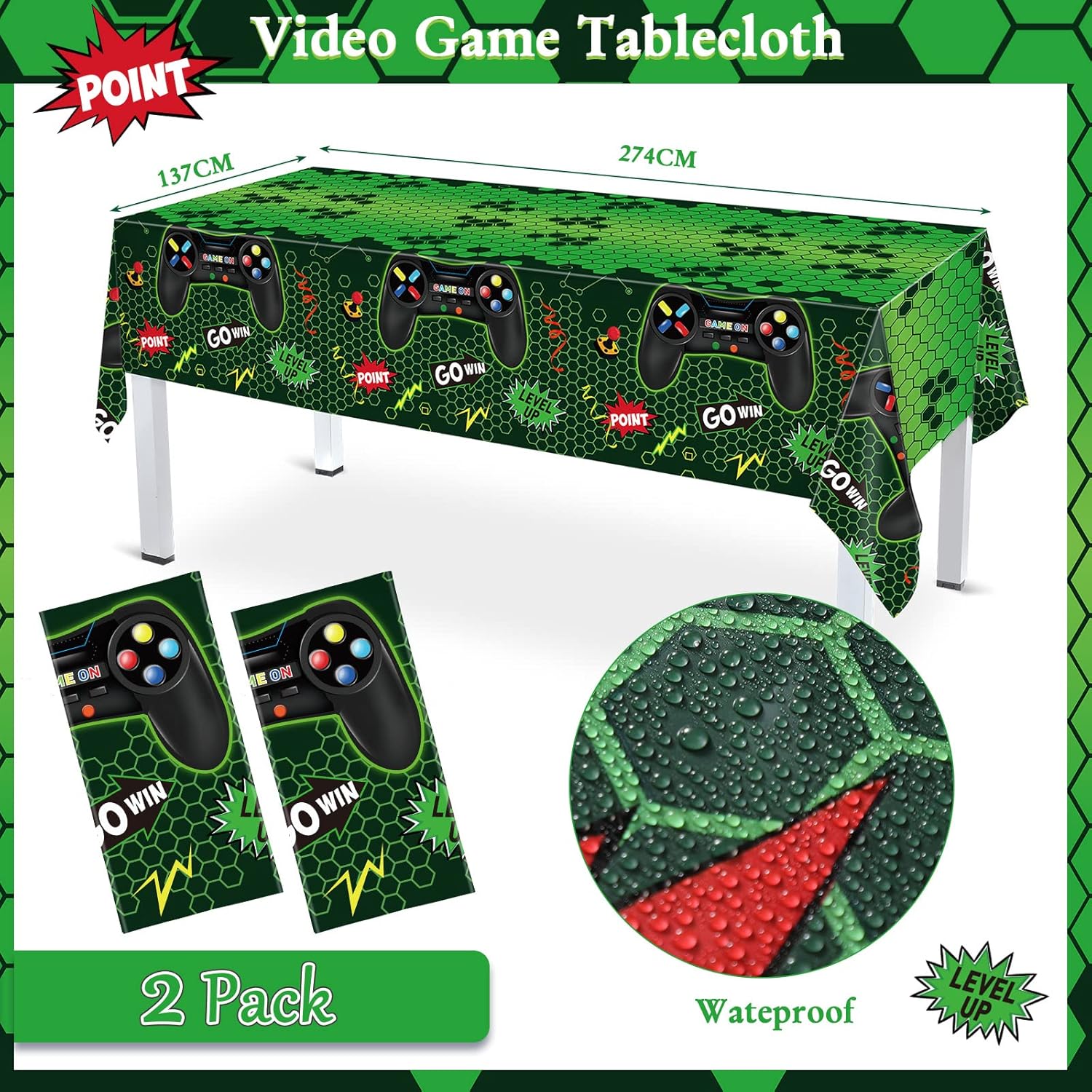 Safe Materials: the gaming party plates, cups, and napkins are made of reliable paper, and are safe to use; The happy birthday banner is colorful and bright without fading easily; The video game tablecloth is made of plastic that is waterproof to protect your table