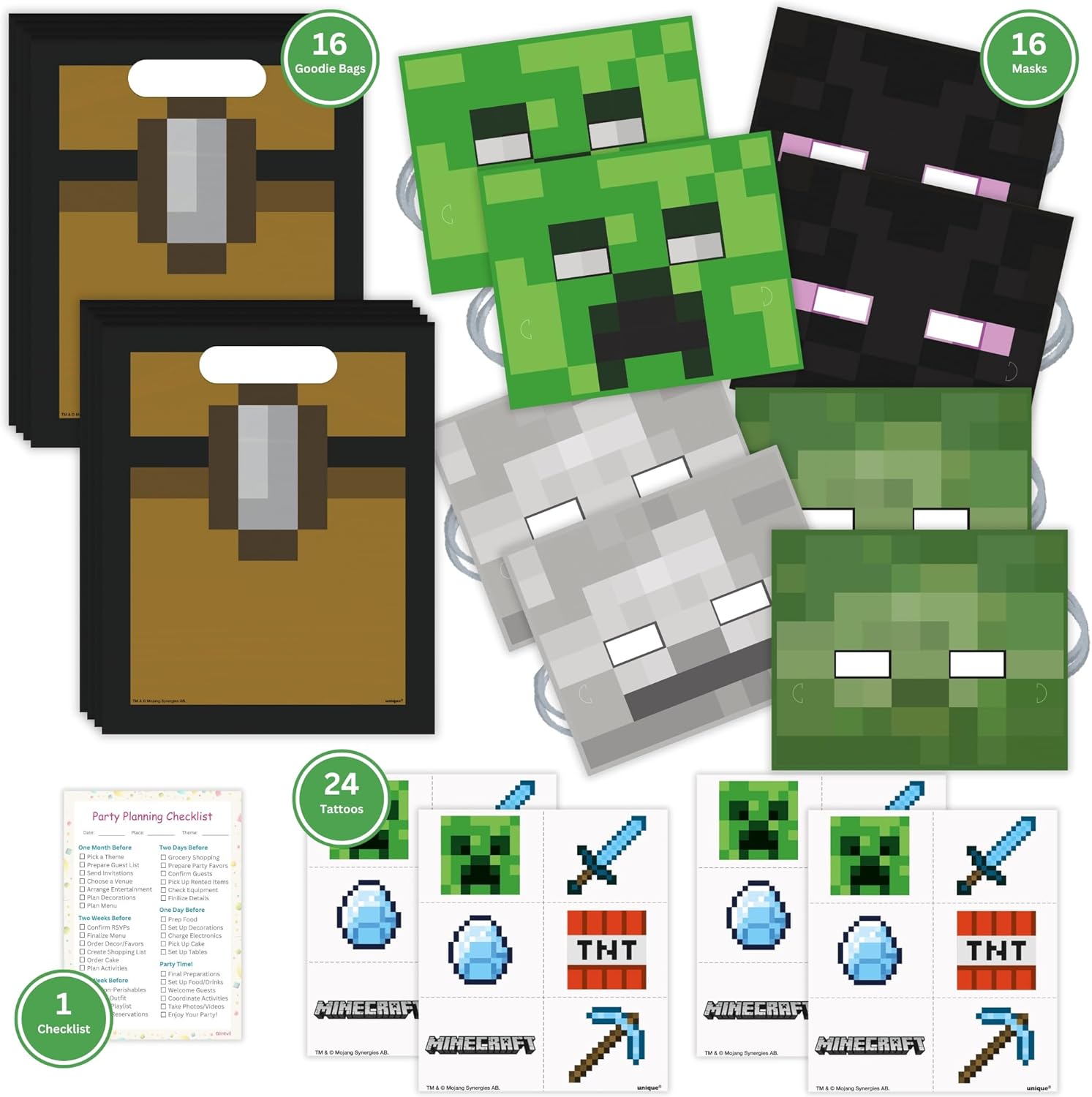Convenient – Includes 16 plastic goodie bags, 24 tattoos, 16 paper Minecraft masks. Also includes 1 party planning checklist to keep your preparations on track.