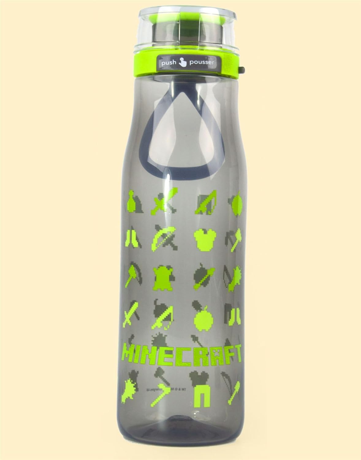 Product Highlights 25-ounce capacity and a wide gulp opening, as well as a slide lock to prevent leaks and spills Made of durable plastic, it’s BPA free and dishwasher safe, please do not microwave. You can toss this bottle in a bag without worry, or use the comfortable silicone carrying strap Perfect for Minecraft Adventure Fans!