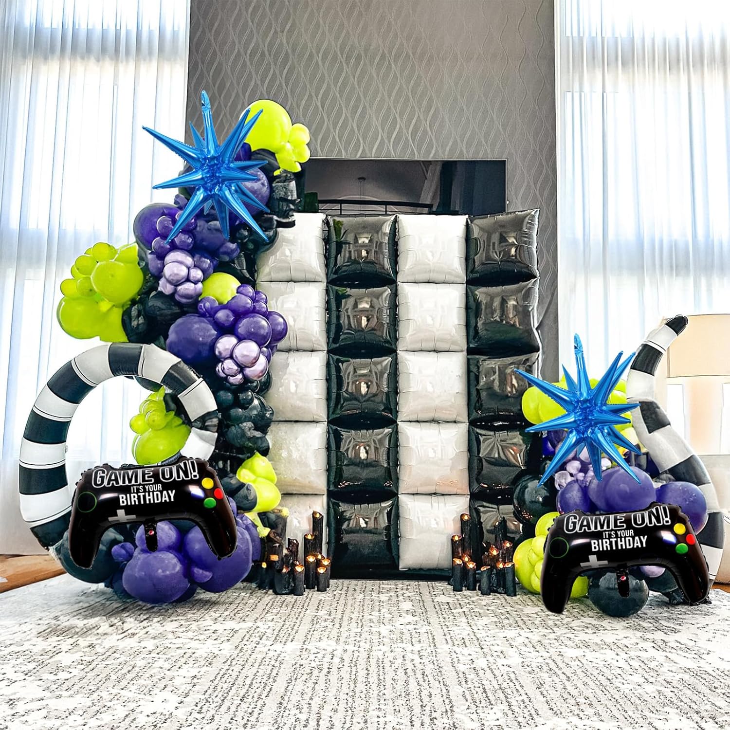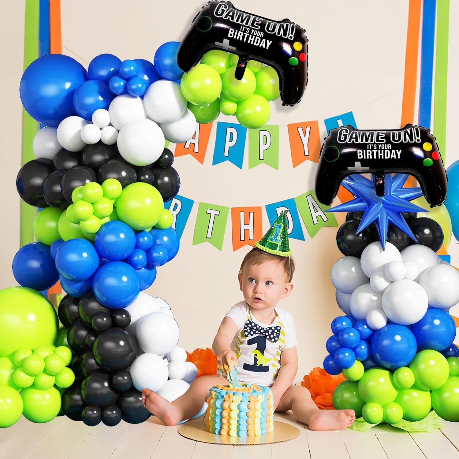 Gaming Balloons Garland Arch Kit: You will get 105 Pcs 5 inch 10 inch 12 inch 18 inch latex balloon kit like matte white balloons (12 In * 8 Pcs, 10 In * 5 Pcs, 5 In * 12 Pcs), black balloon (10 In * 12 Pcs, 5 In * 12 Pcs), navy dark blue balloons (18 In * 1 Pcs, 10 In * 12 Pcs, 5 In * 12 Pcs), fruit green balloons (18 In * 1 Pcs, 10 In * 12 Pcs, 5 In * 12 Pcs), along with 2pcs game mylar balloon, 1pc explosion star balloon, 16ft balloon stripe tape (1 roll), 100pc balloon sticky dots (2 roll).
