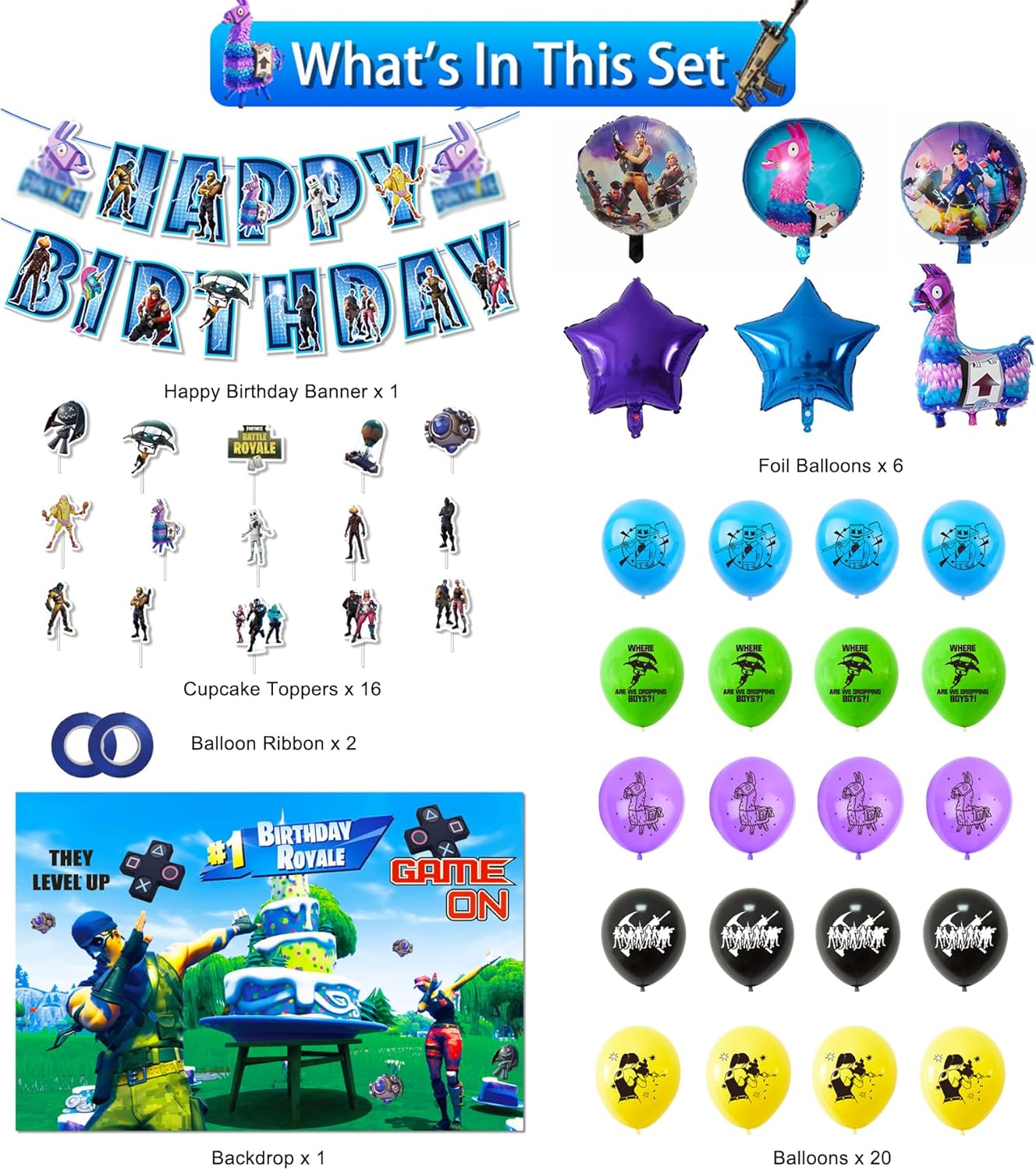 44Pcs Party Decorations Kit: This gaming-themed decoration set includes 1 backdrop, 1 happy birthday banner, 16 cupcake toppers, 20 latex balloons, 6 foil balloons, and 2 balloon ribbons—everything you need to throw an unforgettable celebration