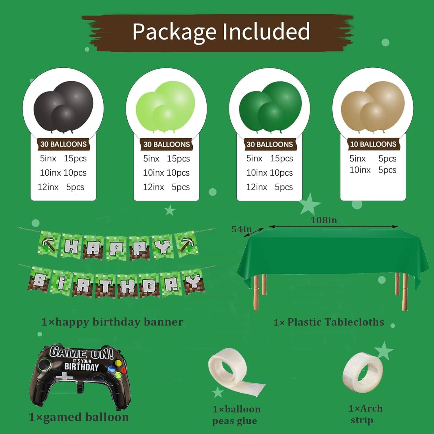 【WHAT YOU WILL GET】1pcs happy birthday banner, 100pcs latex balloons in assorted size, namely 12/10/5inch, 1pcs tablecloths, 1pcs gamepad balloon, 5m/16.4ft balloon chain, 100pcs balloon glue points.