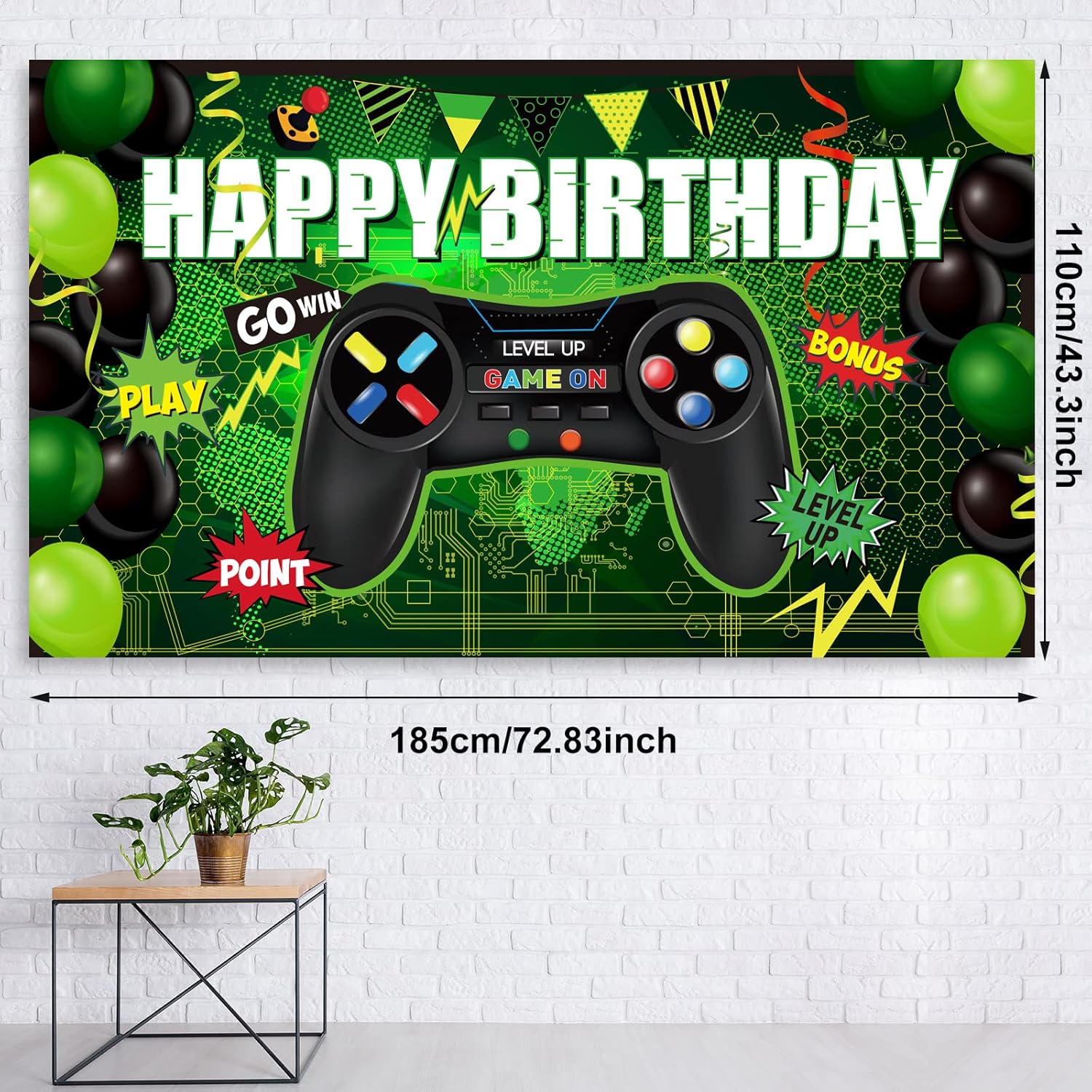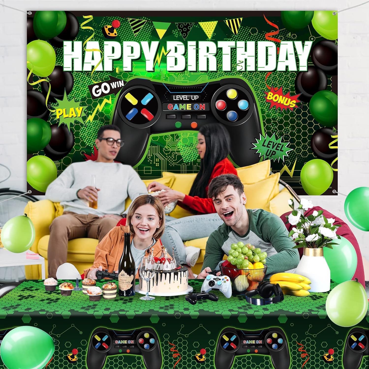 Video Game Birthday Party Decorations Set Gaming Happy Birthday Supplies Includes Video Game Backdrop, Table Covers, Balloons and Foil Gamer Balloons for Party(Green and Black)