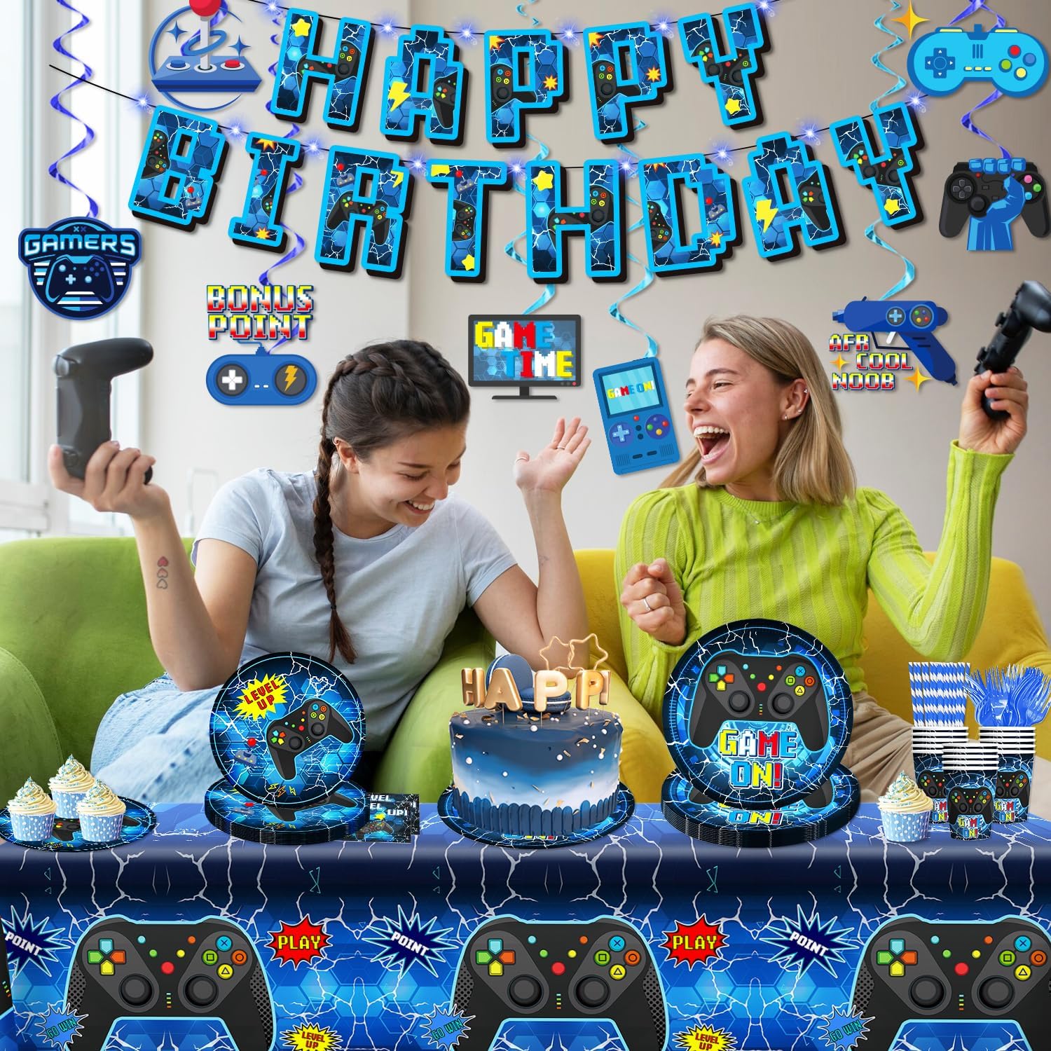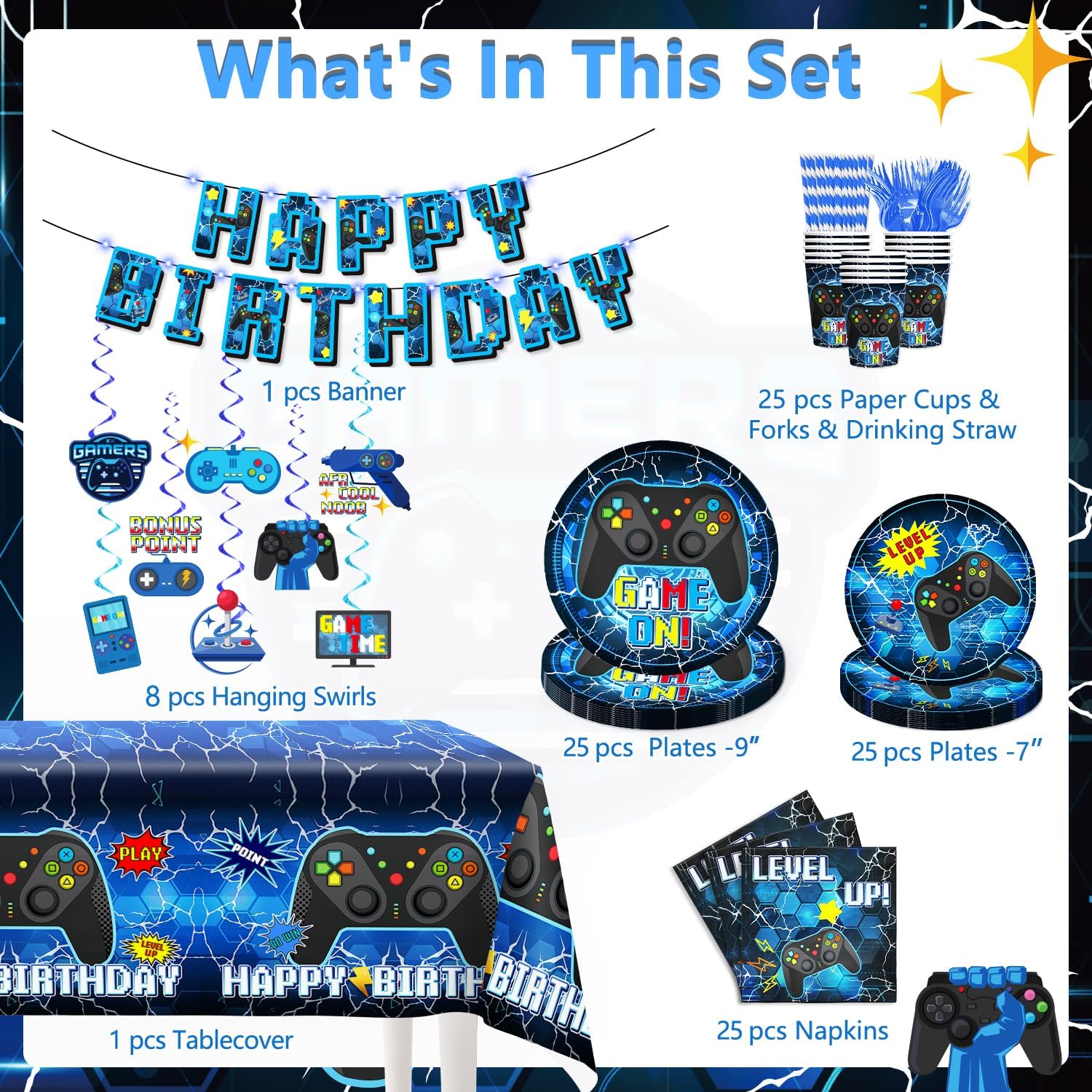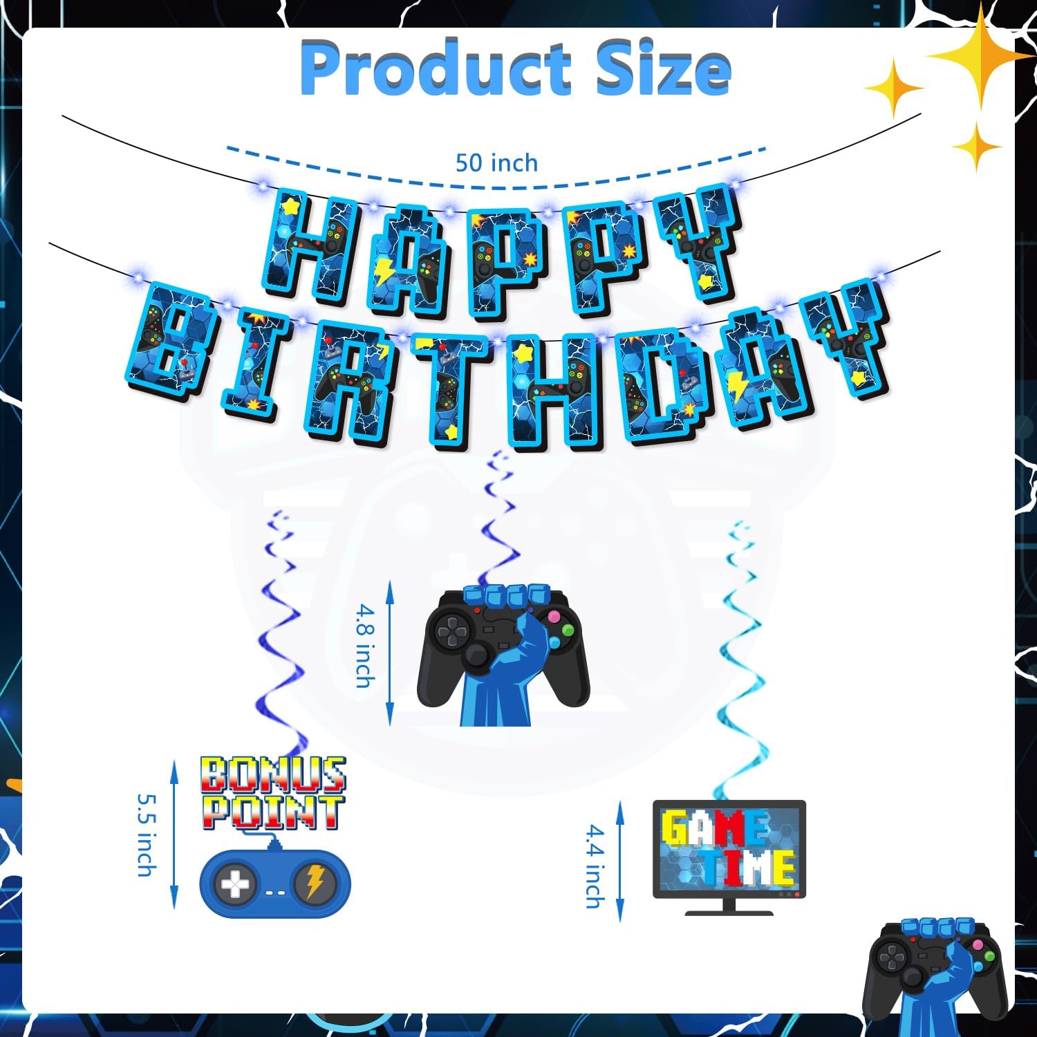 Package Includes: You will receive 169 pieces of gamer birthday party decorations in this gaming birthday decoration set, including 1 x video game birthday banner with 118.2 inch blue string lights,8 x video game card, 8 x hanging swirls, 1 x video game tablecloth 70.9 x 42.3 inch, a tableware set for 25 guests including forks, straws, 7 inch dessert plates, 9 inch dinner plates, napkins and cups,these game birthday decorations are enough to satisfy your kids and family