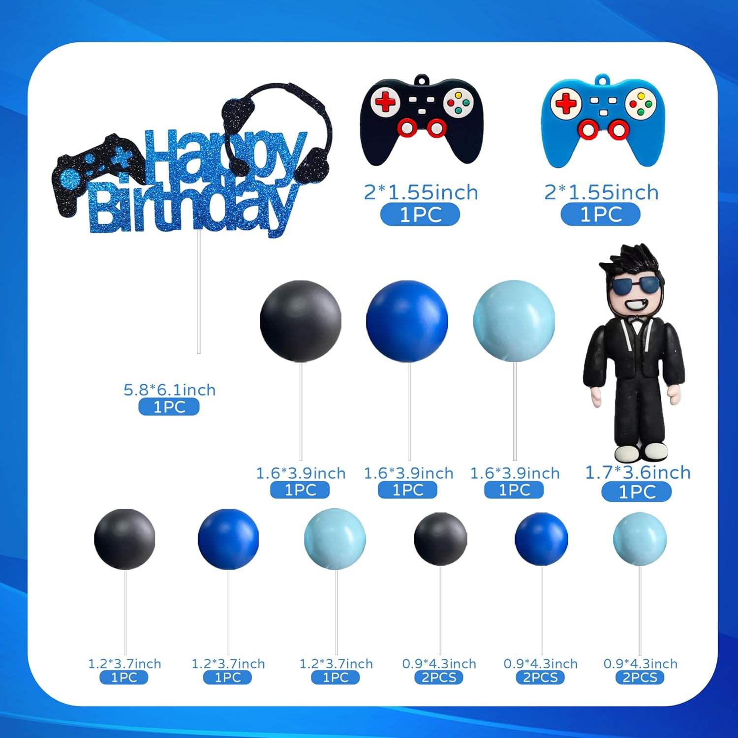 Package Contents: 1 gamer figurine cake topper, 1 happy birthday cake topper, 2 game controller cake decors, 4 black balls, 4 blue balls, 4 navy blue ball cake toppers.