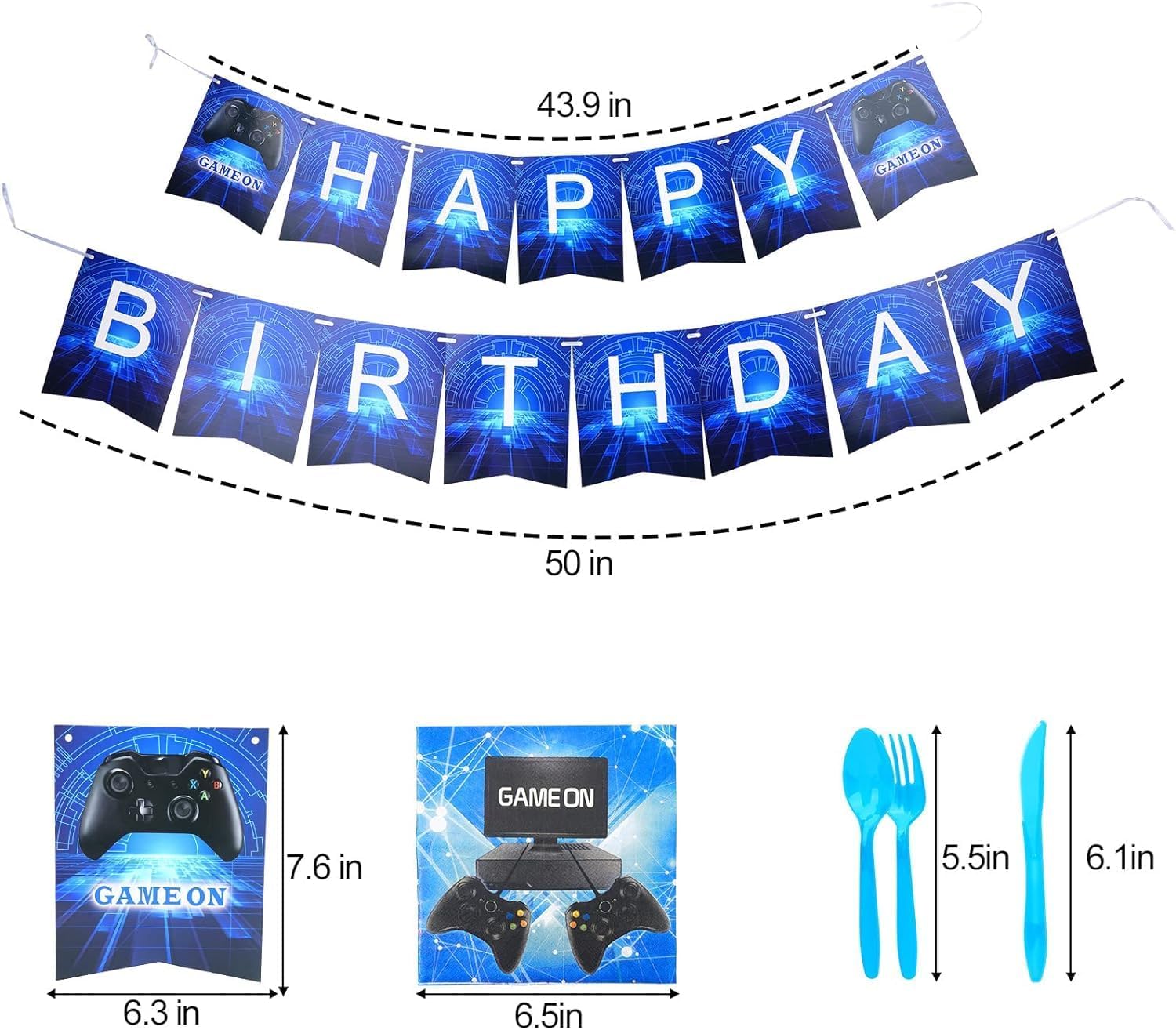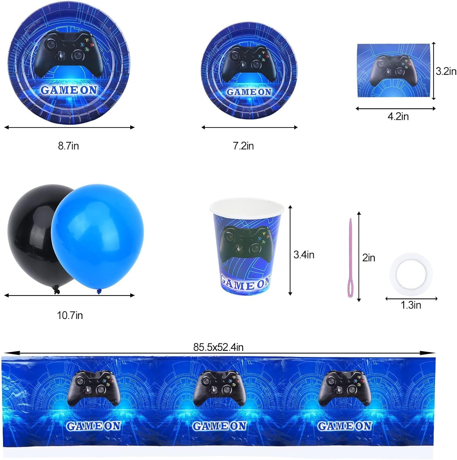 WHAT’S INCLUDE?:Our video game party supplies contains 20 knife,20 fork, 20 spoon,20 napkins, 20 7inch Dessert Plates, 20 9inch Dinner Plates,20 cup, 1 table cover,20 invitation card,1 banner,6 blue balloon,6 black balloon