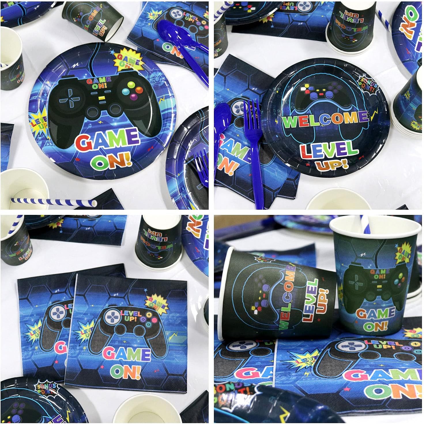 VALUE PACKAGE – Games birthday decoration party supplies set. Include happy birthday gaming banner, 9inch dinner plates x 20, and 7inch desserts plates x 20, cups x 20, napkins x 20, forks x 20, spoons x 20, knives x 20, straws x 20, and game tablecloth.