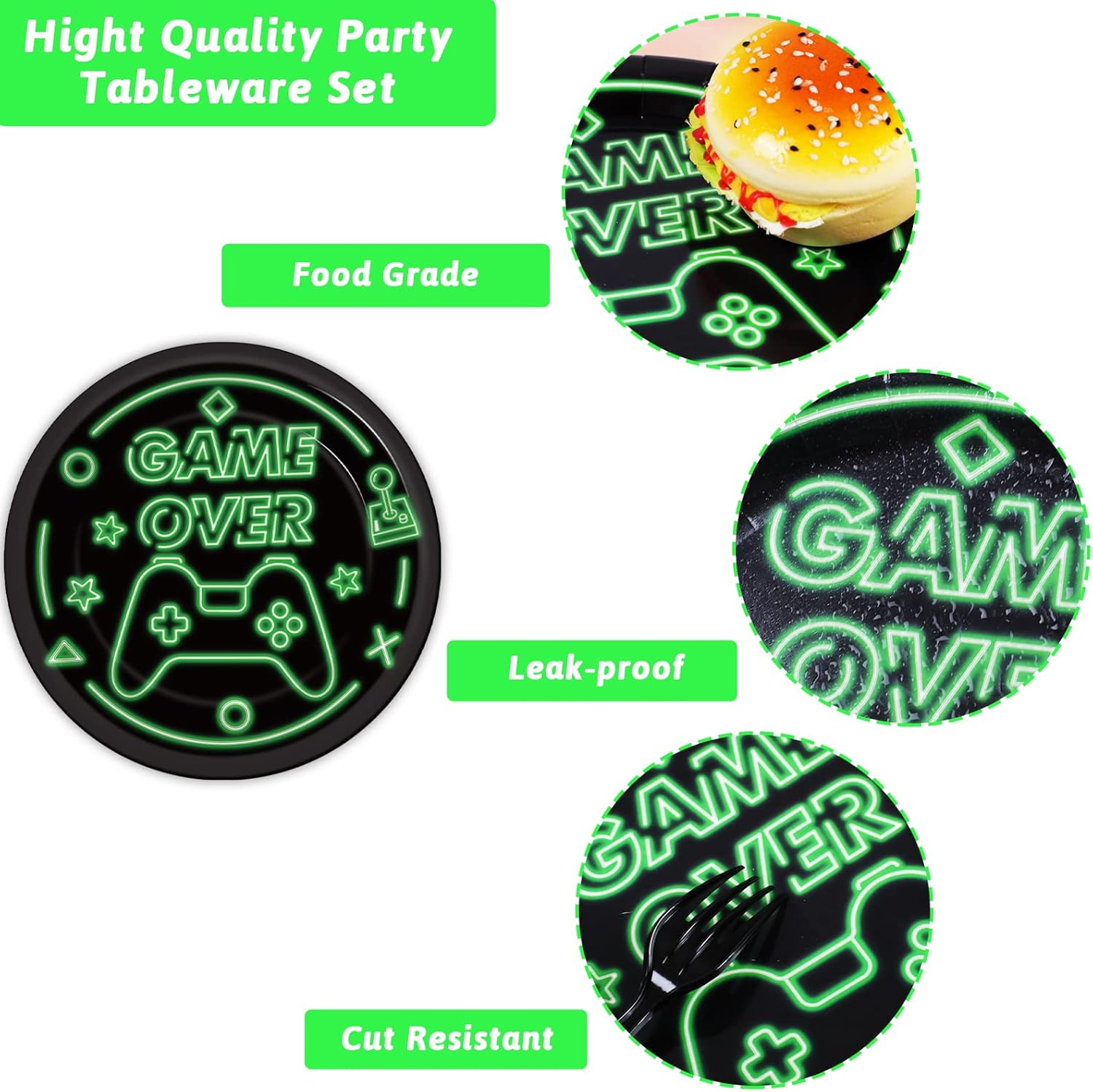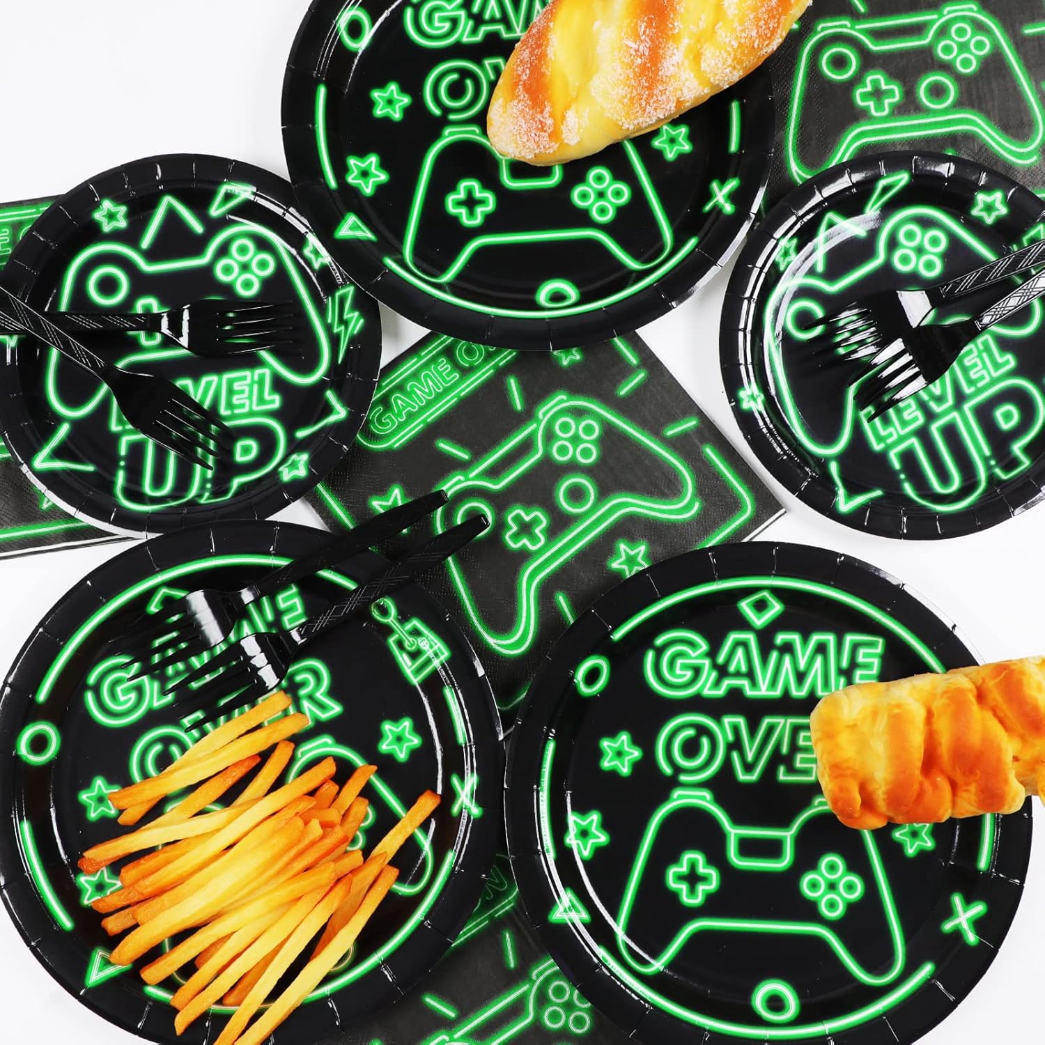 【Gamer Party Set Serves 24】: Our gaming party set includes 24 9” dinner plates featuring a game controller on top of the words game over on it, 24 7” dessert plates featuring small game controller and the words level up on it, 50 Luncheon Napkins written “game on” on it, and 24 black forks.