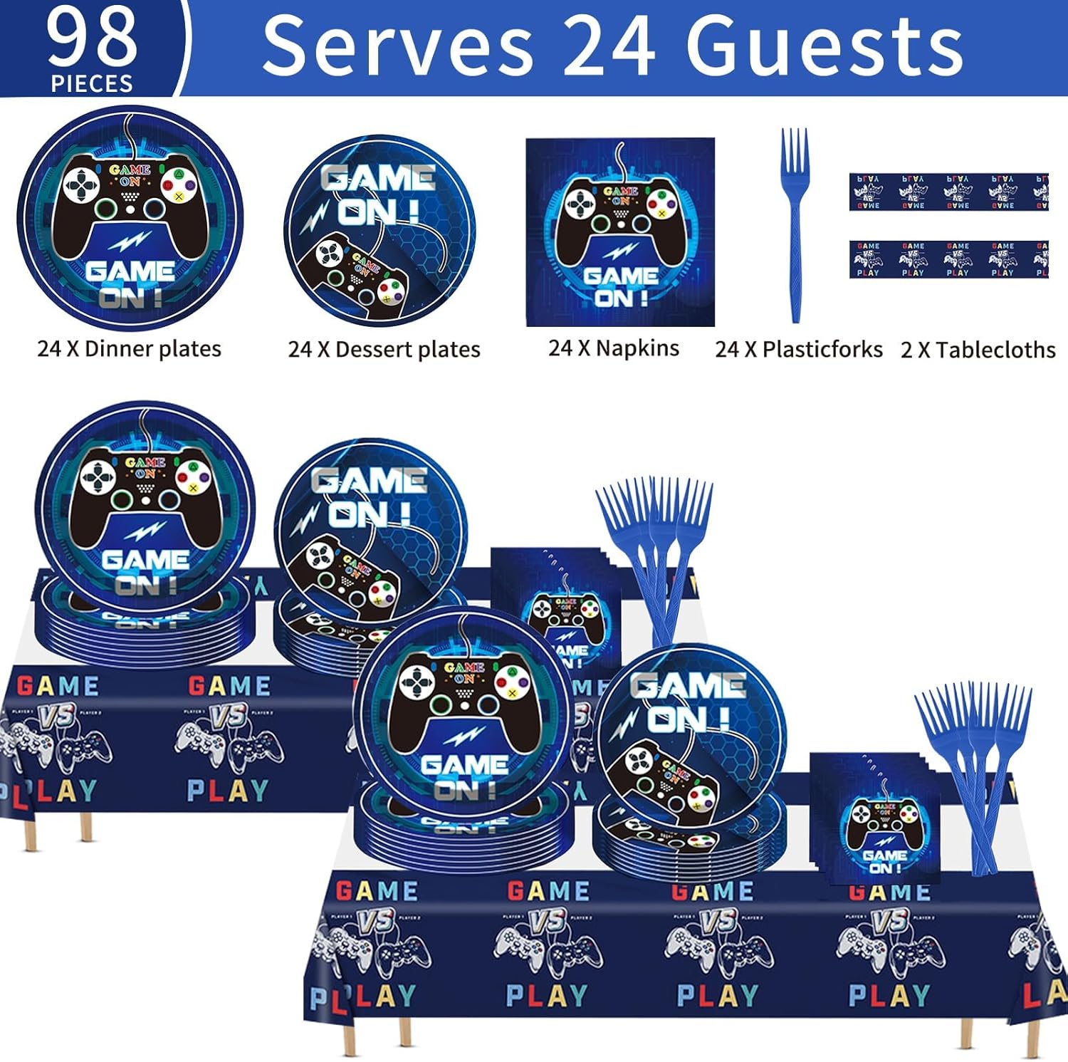 Set Includes: The video game decorations set includes 24 plates, forks, napkins, and 2 tablecloths, catering to the needs of 24 guests and adding a touch of fun to your party table
