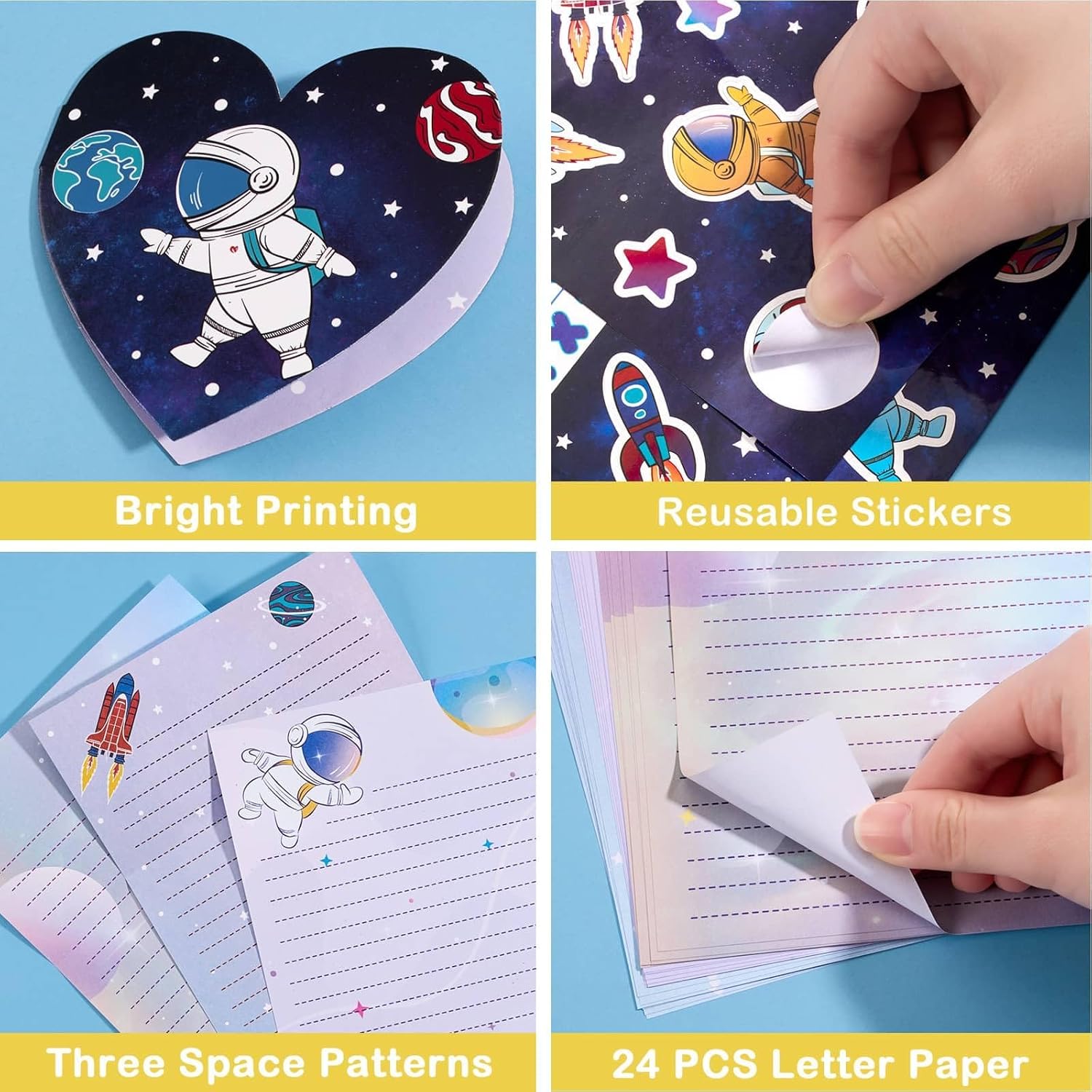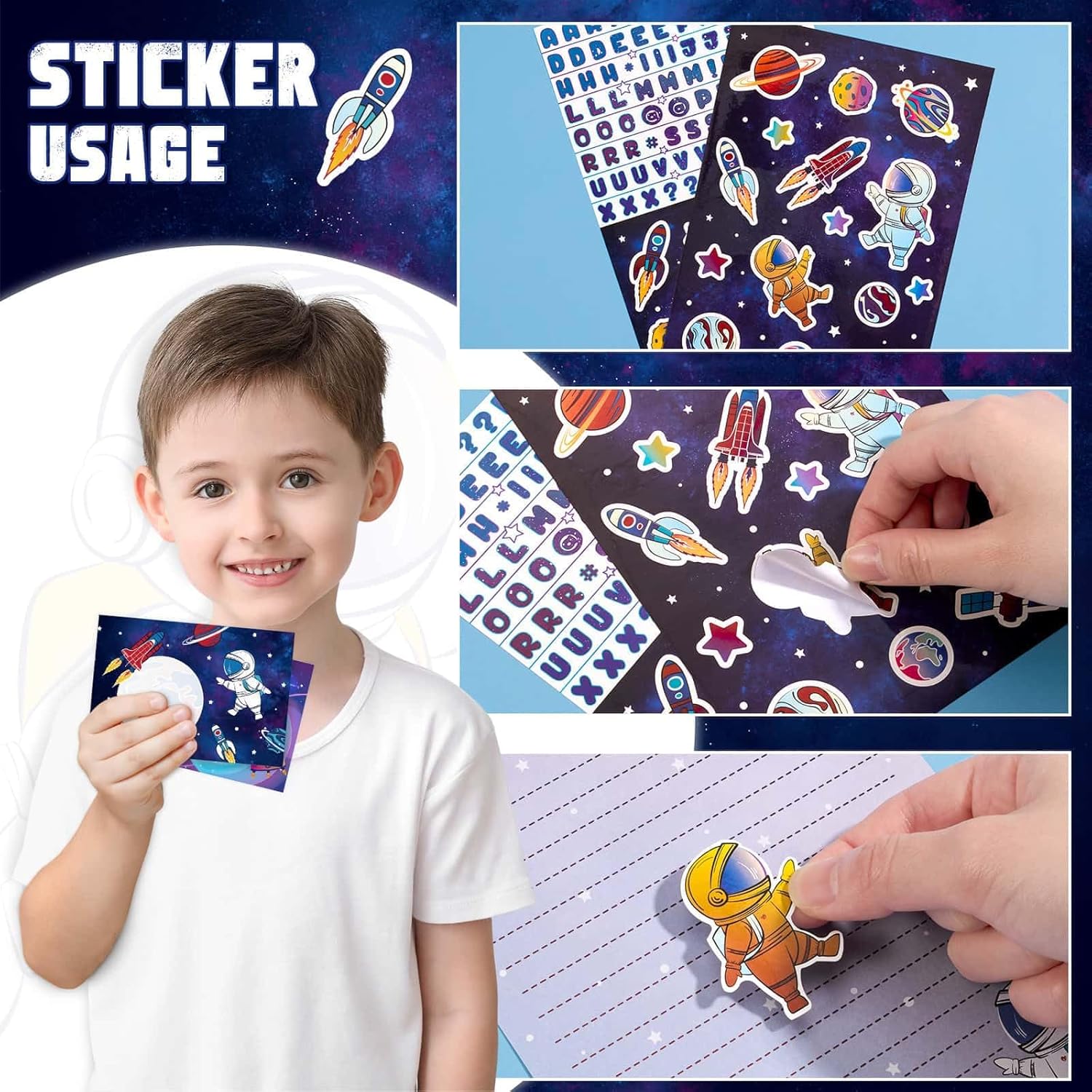 VERSATILE LETTER PAPER: Use this space-themed stationery set to write invitations, thank you letters, or keep in touch with family and friends. The set also includes 2 sheets of universe stickers for extra fun