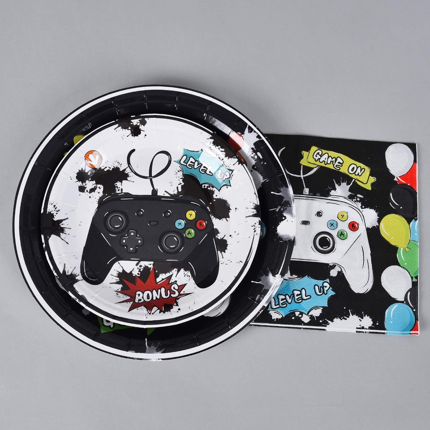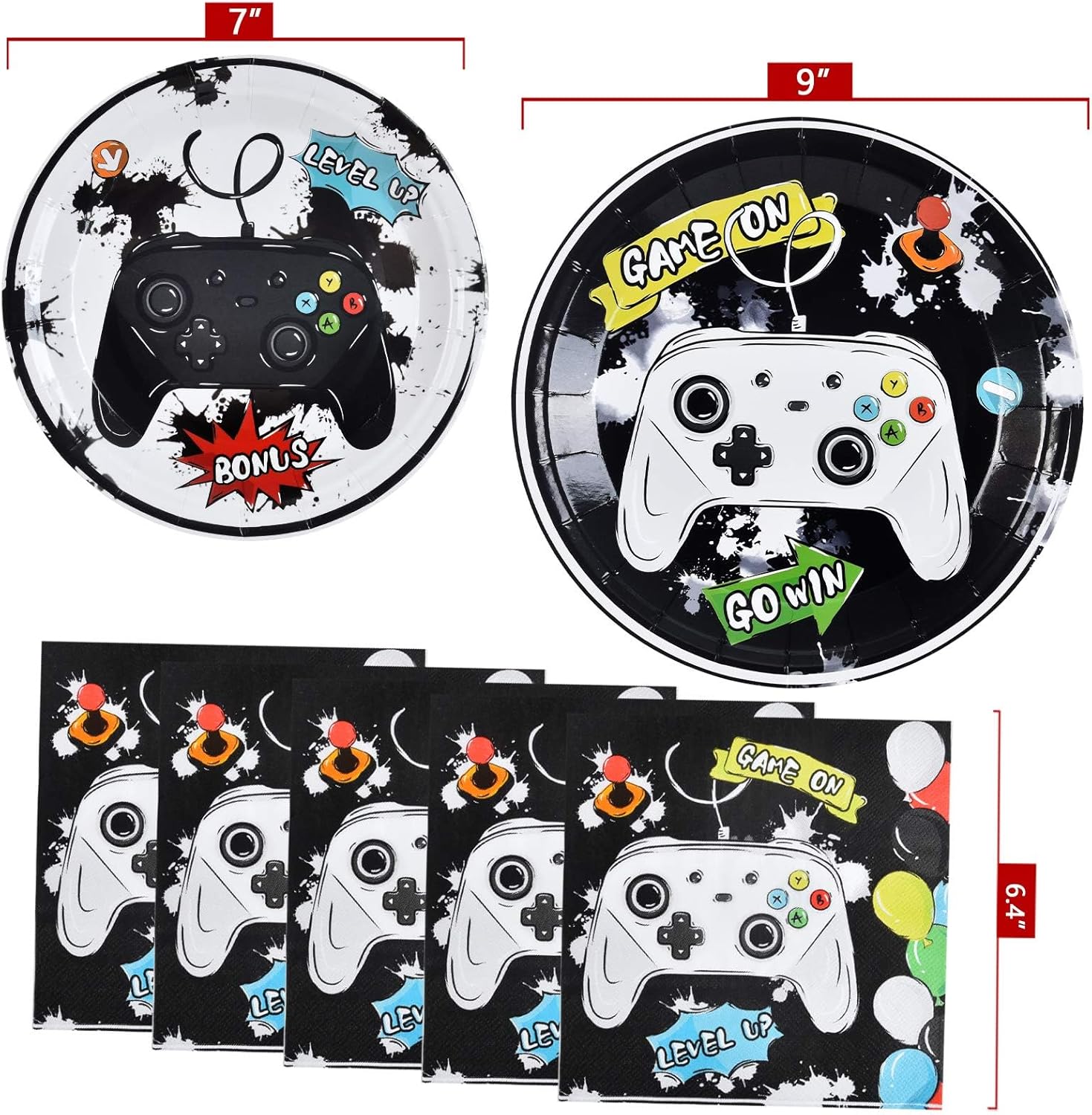 – PACKAGE & SIZE – 16 × large 9“ video game plates / 16 × Small 7” video game plates / 16 × 12.8” gaming napkins, ensuring ample supplies for your gaming -themed party needs.