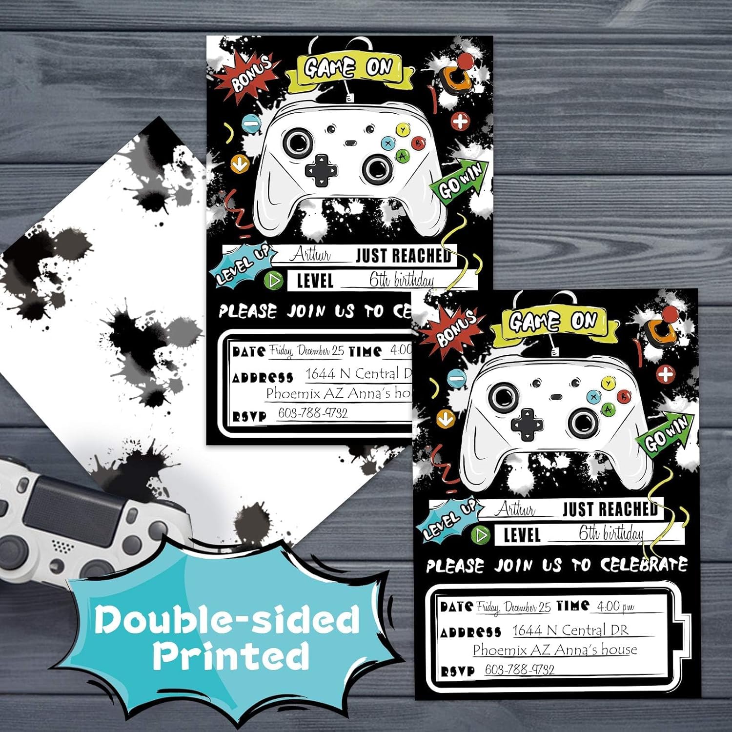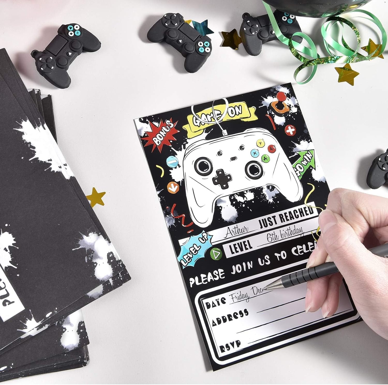 WERNNSAI Watercolor Video Game Party Invites – 20 Set Fill-in Invitations with Envelopes for Boys Game Theme Birthday Party Supplies Double-Sided Printed Invitation Cards