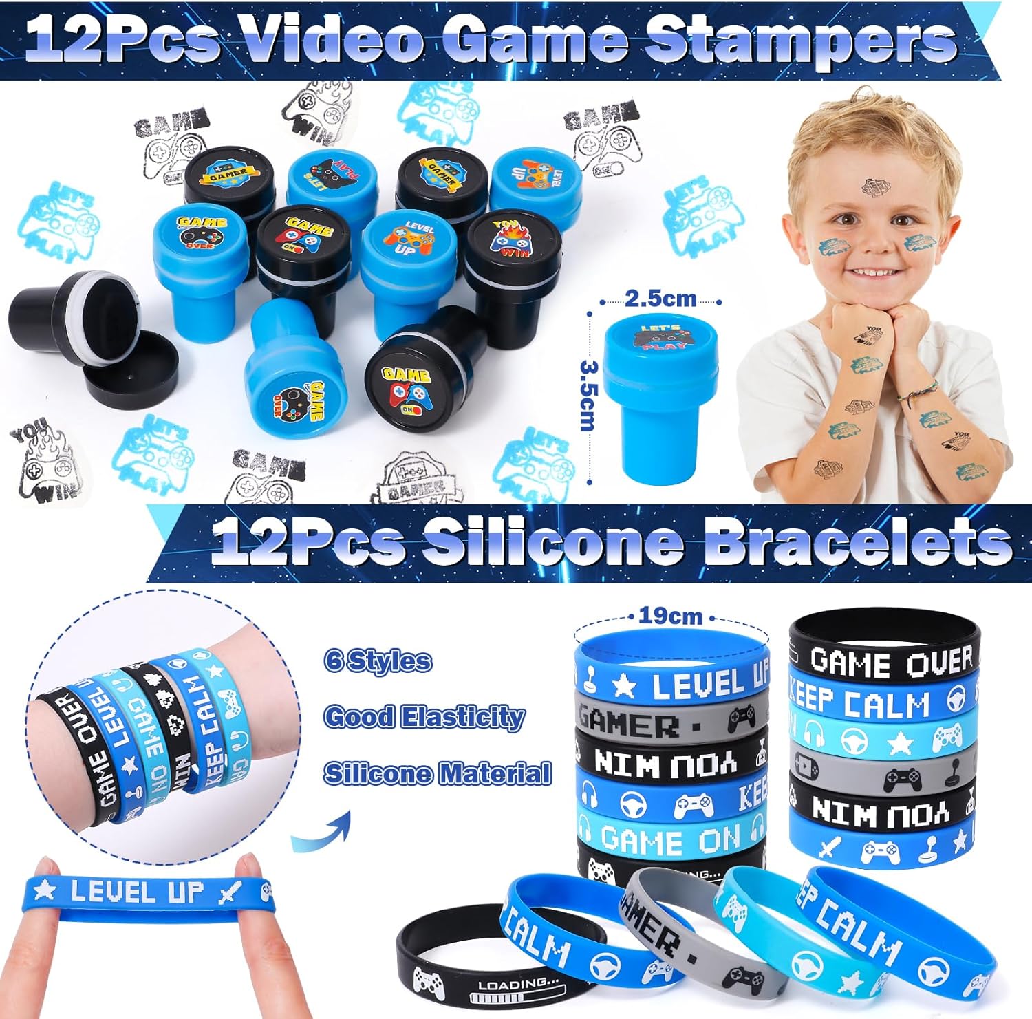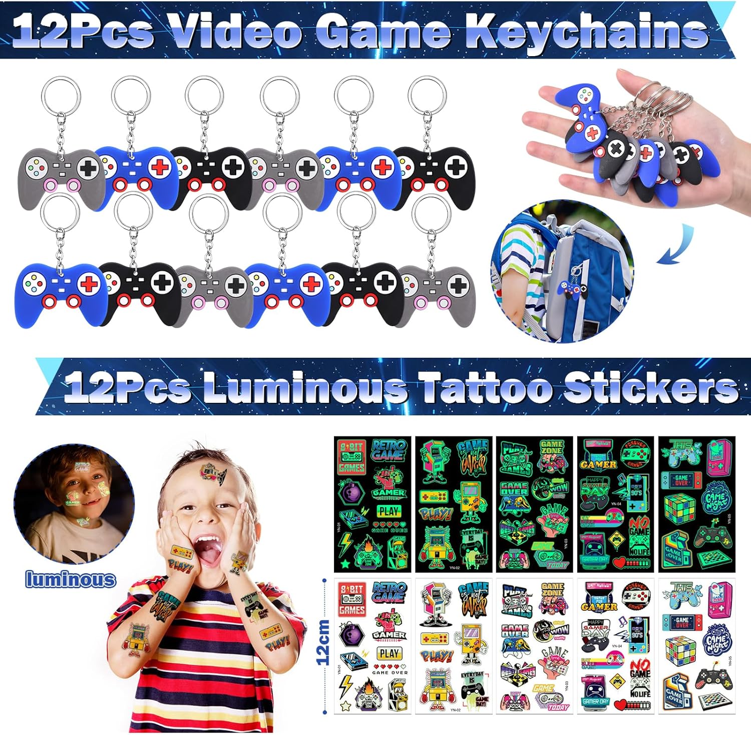 136Pcs Video Game Party Favors: We have carefully prepared a set of luxurious and complete game-themed party favors for game fans. It includes 12 drinking straws (6 styles), 12 VIP pass holder tickets, 12 paper bags (with stickers), 12 silicone bracelets (6 styles), 12 game stampers, 12 glow-in-the-dark tattoo stickers, 12 keychains, 50 game stickers. Our kit can help you throw a big party for 12 little ones and bring a lot of fun to the kids