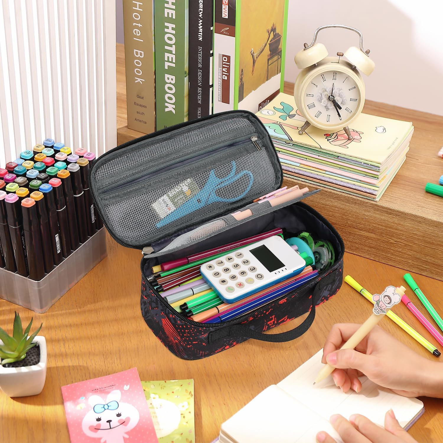 【Practical Design】The pen pouch has a simple 5 compartment design that is clearly visible so you can easily see everything you have. The elastic mesh pocket helps you to separate small things, the pen slot compartment holds your pens in place, and the two main compartments organize your items separately. Cool design improves your efficiency.