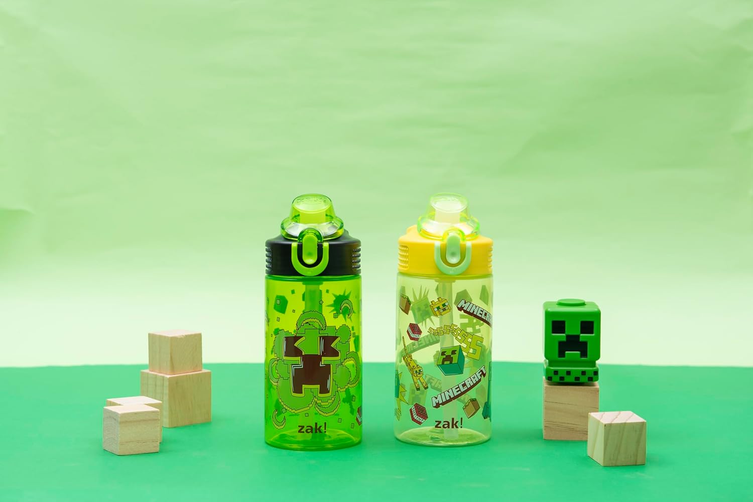 Zak Designs Minecraft Sage Kids Water Bottle For School or Travel, 16oz Durable Plastic Water Bottle With Straw, Handle, and Leak-Proof, Pop-Up Spout Cover, 2-Pack Set (Creeper)