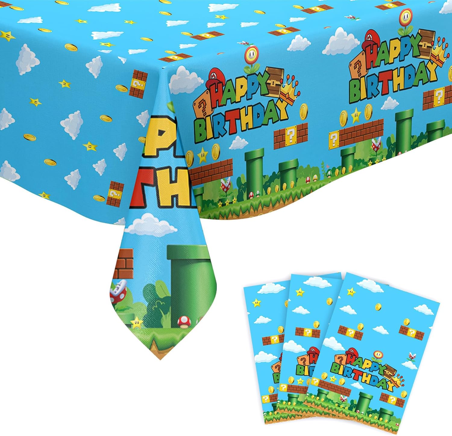 Make Your Party Stand Out: Our children’s party tablecloth features game iconic elements such as red hat, blue sky and white clouds, green pipes,gold coins, and interesting question blocks, capturing the essence of adventure and excitement. Adding the words “Happy Birthday” makes it the perfect decoration for a birthday party. This themed tablecloth will create an unforgettable atmosphere for everyone, making your party stand out.